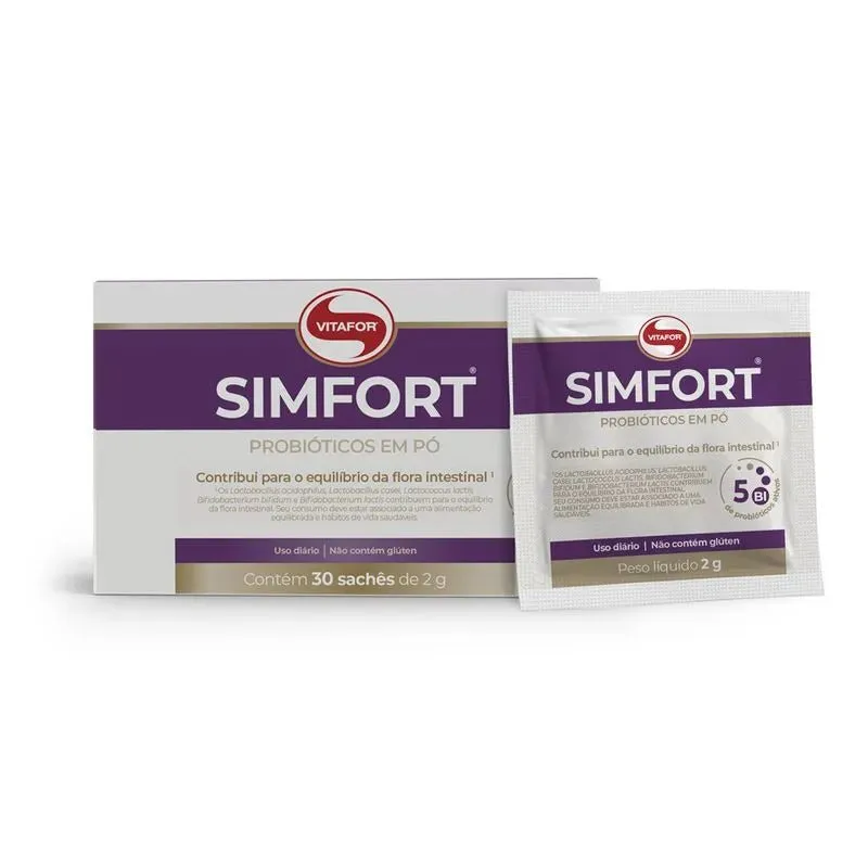 Sabemos da importância de ingerir bons alimentos para abastecer nosso corpo com os nutrientes necessários para uma boa saúde, só que por vezes não damos a devida atenção ao processo digestivo para que nosso corpo possa absorver os nutrientes²³. Nesse processo digestivo o intestino é responsável pela absorção da maioria dos nutrientes, além da eliminação das toxinas. O intestino é como uma selva composta por mais de um trilhão de seres vivos, quando essa microbiota está equilibrada, o intestino vai cumprir suas funções de forma eficiente²³. Além da absorção dos nutrientes, o intestino está conectado diretamente com cérebro, sendo inclusive chamado como “segundo cérebro”, por ser a região do corpo com maior número de neurônios depois do cérebro4. Nessa relação o intestino libera neurotransmissores, como a serotonina, conhecida pelo efeito de bem-estar. Outra participação essencial do intestino é em nosso sistema imune, é no intestino que se concentram 70% das células imunológicas7. A microbiota é composta por centenas de espécies de bactérias que ajudam nas funções intestinais, os principais tipo são bifidobactérias e lactobacilos. A saúde destas bactérias pode ser afetada pelo estresse, consumo de corantes, conservantes, álcool, tabaco, agrotóxicos e antibióticos5. Nosso modo de vida cotidiano favorece a morte de boas bactérias, seja pelo estresse ou pelos hábitos alimentares. E como resultado do enfraquecimento da microbiota intestinal, abre-se caminho para outros problemas5. Além de evitar consumir alimentos prejudiciais, alguns suplementos alimentares são auxiliares na reconstituição de uma flora intestinal saudável. Os probióticos são compostos de bactérias boas presentes em nosso intestino que podem ser ingeridos em forma de suplementação6. Ao ingerir estes probióticos você pode contribuir com o seu corpo repondo bactérias boas. SIMFORT® Vitafor é a tradição do probiótico. Um produto com cinco cepas de micro-organismos vivos que agem em sinergia contribuindo para o equilíbrio da flora intestinal1. A dose do Simfort contém micro-organismos liofilizados e altamente concentrados: Lactobacillus acidophilus, Lactobacillus casei, Lactococcus lactis, Bifidobacterium bifidum e Bifidobacterium lactis. São um total de 5 bilhões de probióticos por dose, que contribuem com o equilíbrio da flora intestinal.