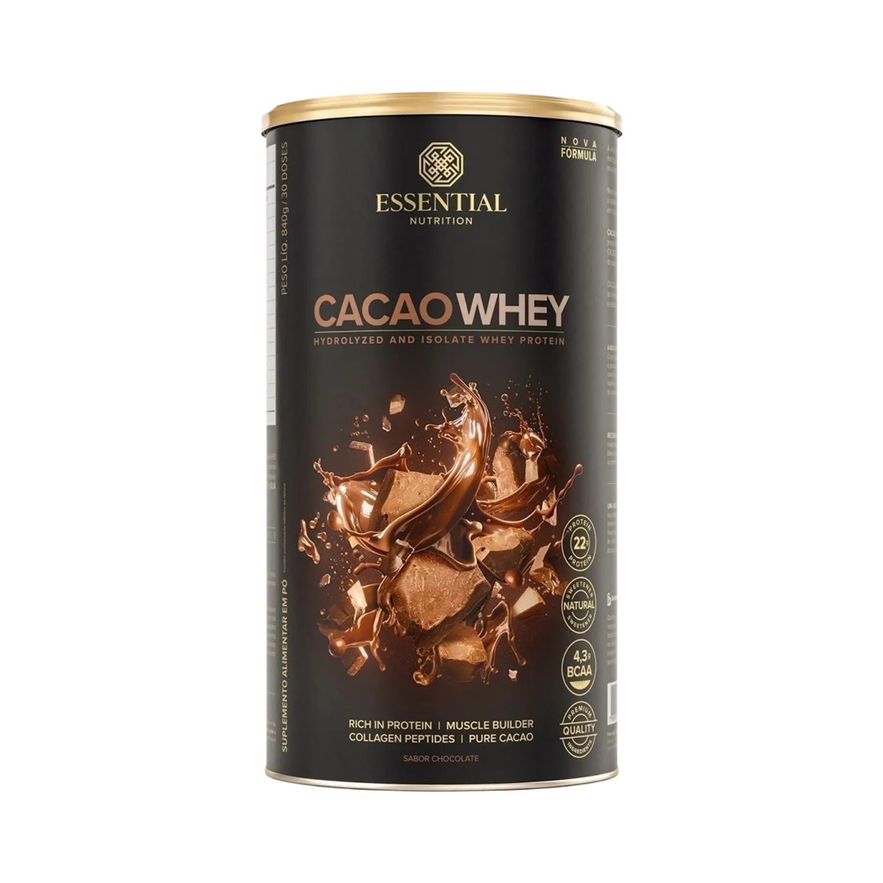 Cacao Whey da ESSENTIAL é um delicioso blend de Whey Protein Hidrolisado e Isolado, Cacau Gourmet e colágeno hidrolisado em peptídeos, que agregam valor à fórmula e complementam a ação do produto.Cada dose de Cacao Whey fornece 44% das necessidades diárias de proteína recomendadas para um adulto. Essas proteínas são obtidas através do CFM (Cross-flow Microfiltration), um processo de extração limpo e purificado, que não utiliza produtos químicos para isolar a proteína de componentes indesejáveis, como caseína, gordura, carboidratos e lactose. Quem vai amar Cacao Whey Esportistas e atletas - Quem pratica esporte e toma whey frequentemente, precisa de um sabor que possa ser consumido com prazer e não fique enjoativo com o passar dos dias. Pessoas em dieta de emagrecimento - Cacao whey é uma ótima opção para o café da manhã e lanches rápidos. É rico em proteína e contém adoçantes naturais. Adultos com consciência saudável - Ideal para quem busca uma proteína com ingredientes que respeitam os princípios da nutrição, bem como todo o potencial humano. Executivos - Ideal para quem tem uma rotina agitada e precisa de uma opção deliciosa e proteica bem no meio da tarde.